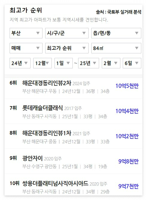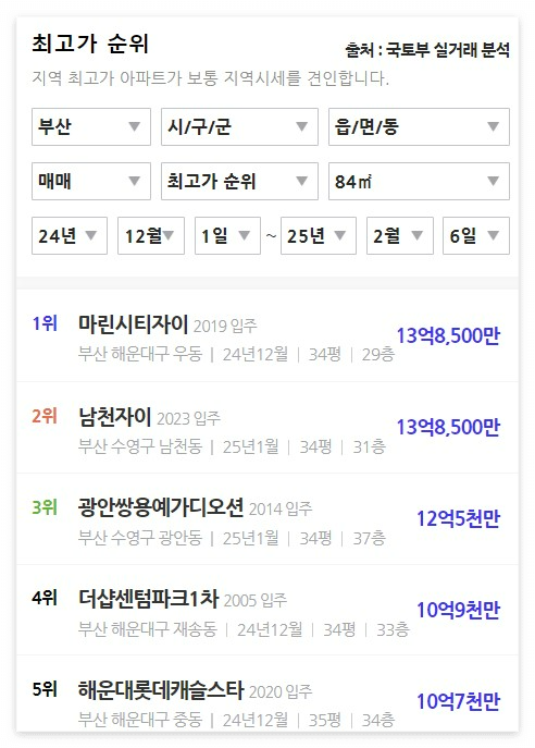 매매 거래량은 '24년 12월 1,931건, '25년 1월 1,025건으로 지난 두 달간 3,000건 거래신고 되었으며 이를 바탕으로 부산 최고가 아파트를 살펴보았습니다.